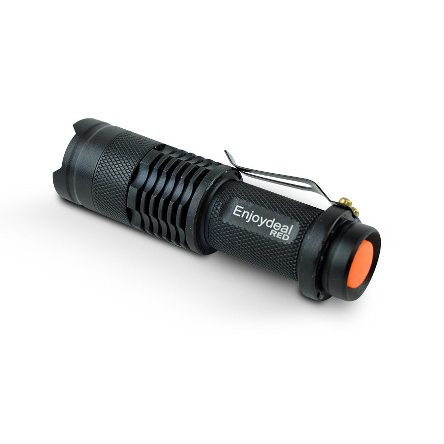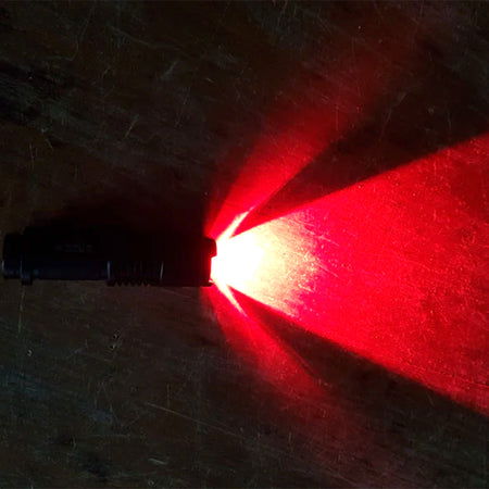 Its pocket sized and runs on 1 AA battery (supplied), very bright Red Cree LED (not a filter).
